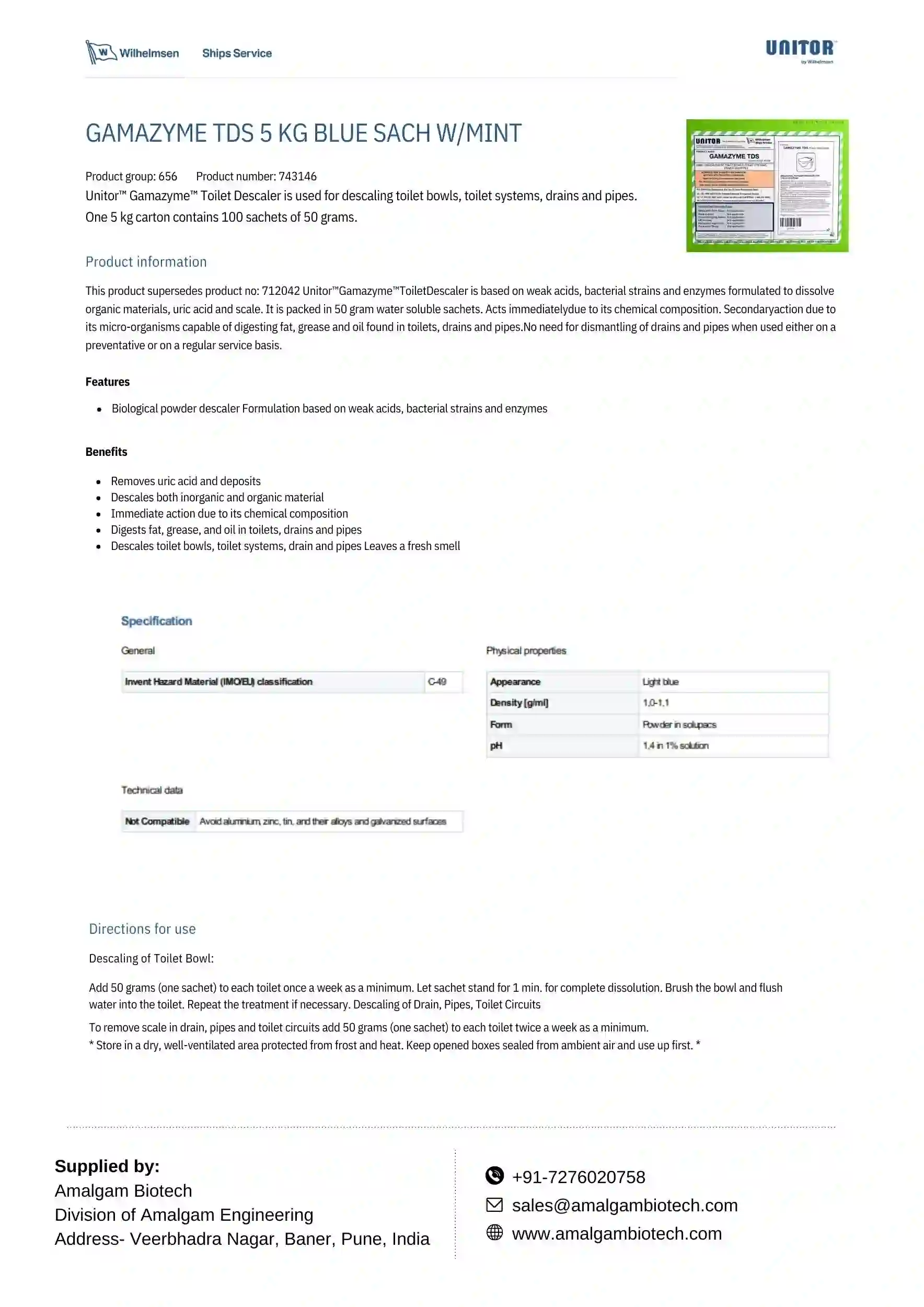 Unitor™ Gamazyme™ toilet Descaler remove scale from toilets, drain and pipes. Each 5 kg carton has 100 X 50-gram sachets.